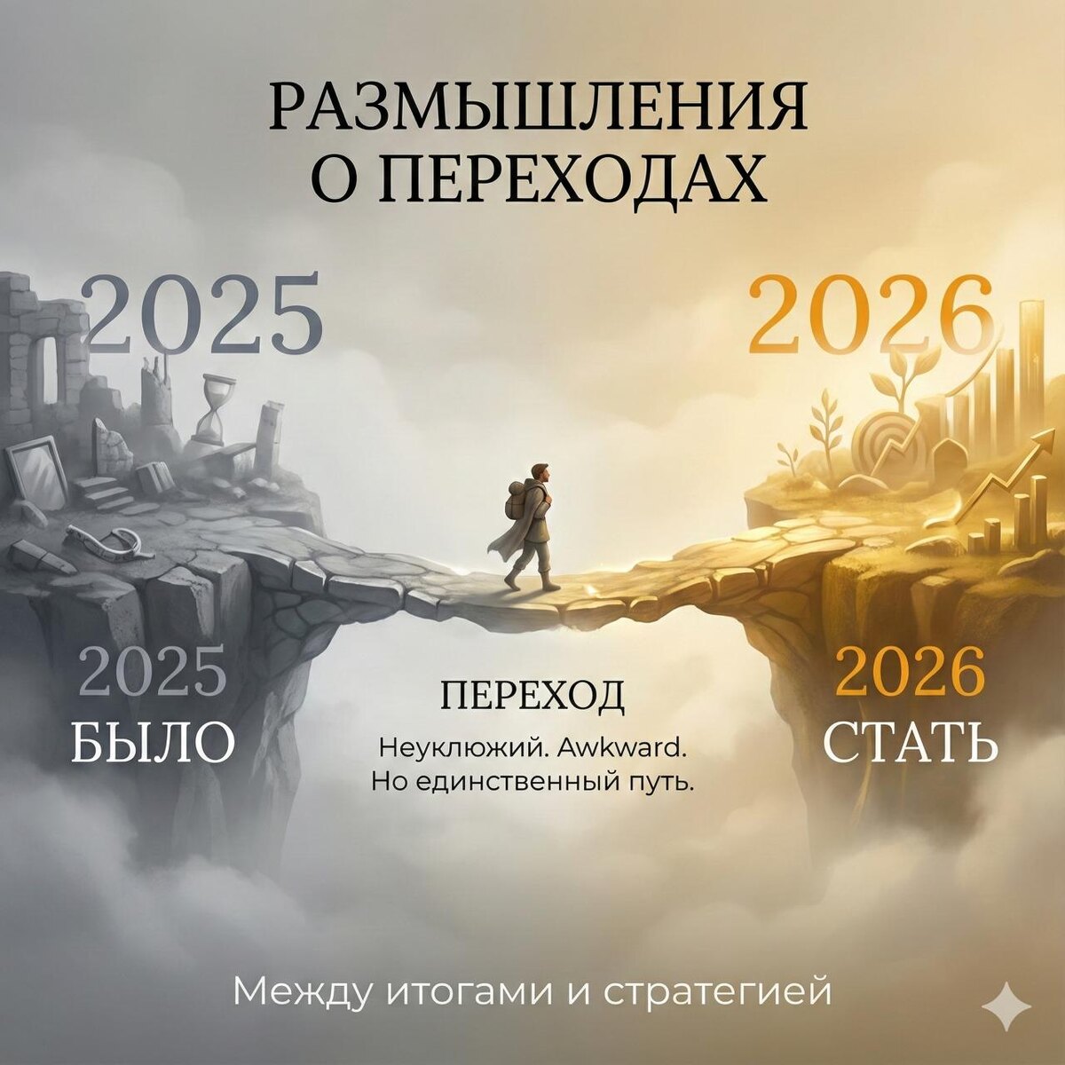 РАЗМЫШЛЕНИЯ О ПЕРЕХОДАХ 🌊 Неделю говорили про честные итоги 2025. Сделали упражнение "два листа". Увидели зазор между иллюзией и правдой. Сегодня — размышления. Между итогами и стратегией. Все хотят сразу. Закрыли 2025 — открыли 2026. Увидели проблемы — решили их. Был ребёнком — стал взрослым. Мгновенно. Но так не бывает. Между "было" и "стало" всегда есть переход. Неуклюжий. Неловкий. Awkward. Когда ты уже не тот, кем был. Но ещё не тот, кем хочешь стать. Я много думал об этом на этой неделе. После честных итогов. После того, как увидел свой зазор. Между тем, кем кажусь, и тем, кто я есть. И понял одно: Нельзя просто "взять и изменить". Есть этап, о котором все забывают. Этап, который все хотят пропустить. Этап перехода. Когда ты осознаёшь проблему. Но ещё не знаешь, как по-новому. Когда ты выбираешь делать по-старому. Но уже осознанно. Это не слабость. Это естественный процесс. Как подростковый возраст. Неуклюже. С ошибками. С попытками. Но это единственный путь. След