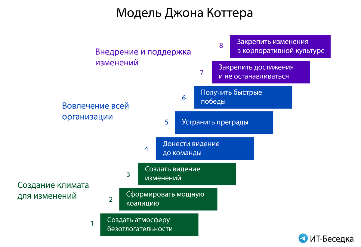 Дело не в том, что изменения опасны. Дело в том, что их внедряют хаотично, без системы. Модель Джона Коттера — это проверенная временем методология, которая превращает "опасные" изменения в контролируемый процесс. 8 шагов Коттера работают как GPS для трансформации: ✅ Создание срочности — команда понимает "зачем меняться СЕЙЧАС" ✅ Формирование коалиции — изменения ведут влиятельные лидеры ✅ Видение будущего — все знают, к чему идут ✅ Коммуникация — информация доходит до каждого сотрудника ✅ Расширение полномочий — убираем барьеры на пути к цели ✅ Быстрые победы — показываем результат уже через 2-3 месяца ✅ Закрепление успеха — не останавливаемся на достигнутом ✅ Укоренение в культуре — изменения становятся частью ДНК компании Главный инсайт: изменения становятся опасными только тогда, когда их внедряют без методологии, целей и правильной работы с командой. Системный подход Коттера дает: • Предсказуемый результат • Минимальное сопротивление персонала • Сохранение производительности в пр