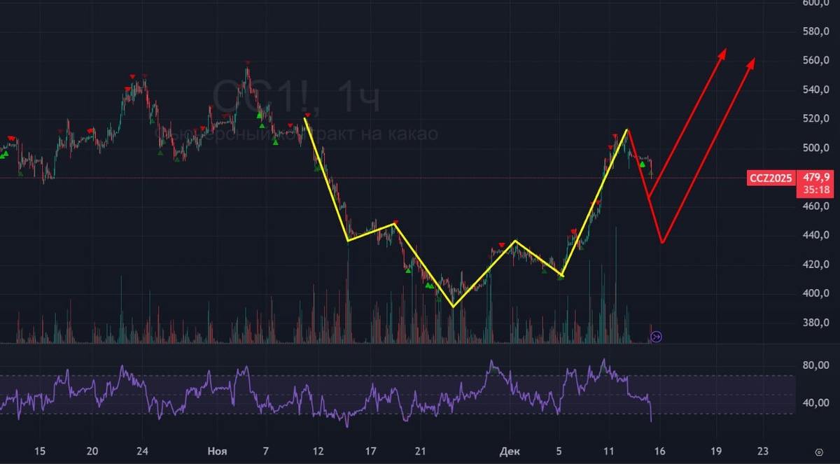 ☕️ Какао: обновление графика 🟢 В пятницу выполнили желтый маршрут ПГИП, теперь идем в коррекцию. Коррекции всегда вариативны, поэтому ее глубину сложно предсказать в текущий момент, но нужно отслеживать разворотные сетапы. #какао #cc1 #cocoa #bogdanoffinvest $CCH6