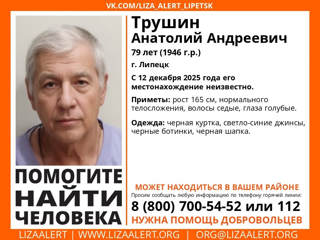 В Липецкой области неделю ищут пропавшего 79-летнего Анатолия Андреевича Трушина. В минувшую пятницу, 12 декабря, пенсионер вышел из дома в областном центре и перестал выходить на связь с близкими. С тех пор о местонахождении липчанина ничего не известно. — Может находиться в любом районе Липецкой области, — прокомментировали в региональном отделении поисково-спасательного отряда «Лиза Алерт». Приметы Анатолия Андреевича: рост 165 сантиметров, нормальное телосложение, седые волосы и глаза голубого цвета. В день исчезновения пожилой липчанин был одет в черную куртку, светло-синие джинсы, черные ботинки и черную шапку. Если вы видели пропавшего пенсионера или что-то знаете о его возможном местонахождении, то сообщите об этом по телефонам — 112 или 8 (800) 700-54-52.
