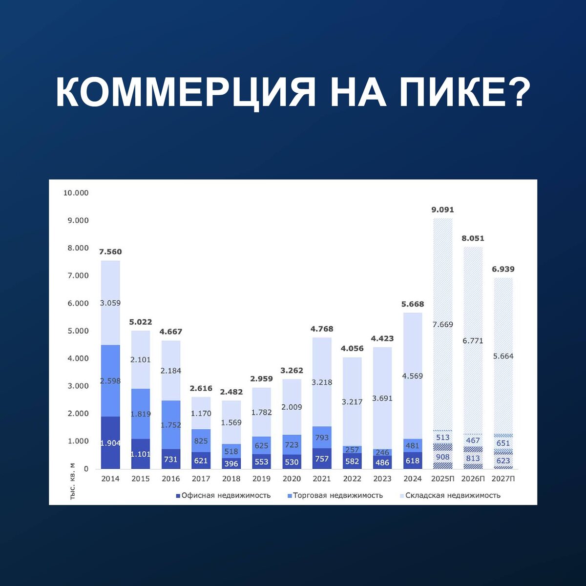 Коммерция в России идёт на рекорд: кто заработает на этом цикле? В 2025 году рынок коммерческой недвижимости в России может показать максимальный ввод за последние 10 лет — до 9,1 млн кв. м, что на 62% больше, чем годом ранее. Драйвер роста — склады: на них придётся около 84% всего объёма. Рынок разгоняют маркетплейсы и продуктовые сети, которые активно строят логистику и заходят в крупные BTS-проекты. Эксперты отмечают, что этот тренд не краткосрочный: высокая доля складской недвижимости сохранится как минимум в ближайшие два года. Это означает устойчивый спрос, длинные контракты и понятную экономику для инвесторов, которые заходят в коммерцию осознанно, а не «на хайпе». Если хотите получить подборку актуальных коммерческих помещений под инвестиции — оставляйте запрос по ссылке. 🤩 Получить подборку помещений под коммерцию #аналитика_Lezvin
