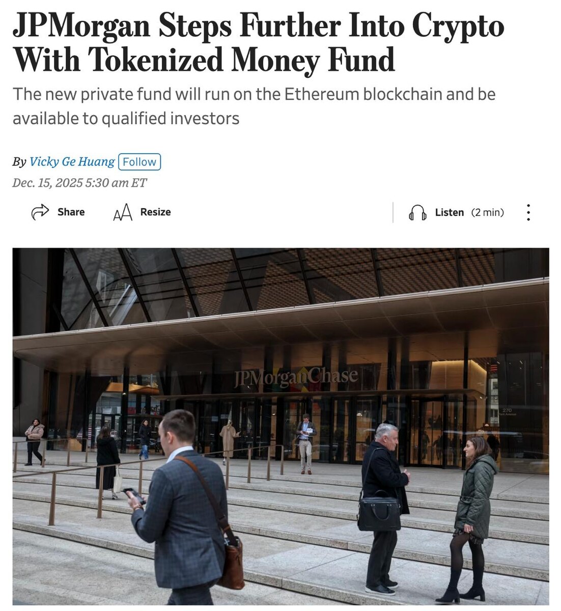 #eth 🏦 JPMorgan запускает токенизированный денежный фонд на блокчейне Ethereum (WSJ) Детали: • Фонд называется My OnChain Net Yield (MONY) и предназначен для квалифицированных инвесторов. • Доли фонда выпускаются в виде токенов, с ончейн-учетом и более быстрым расчетом. • По сути, это классический money market fund, но в блокчейн-обертке. Crypto Headlines