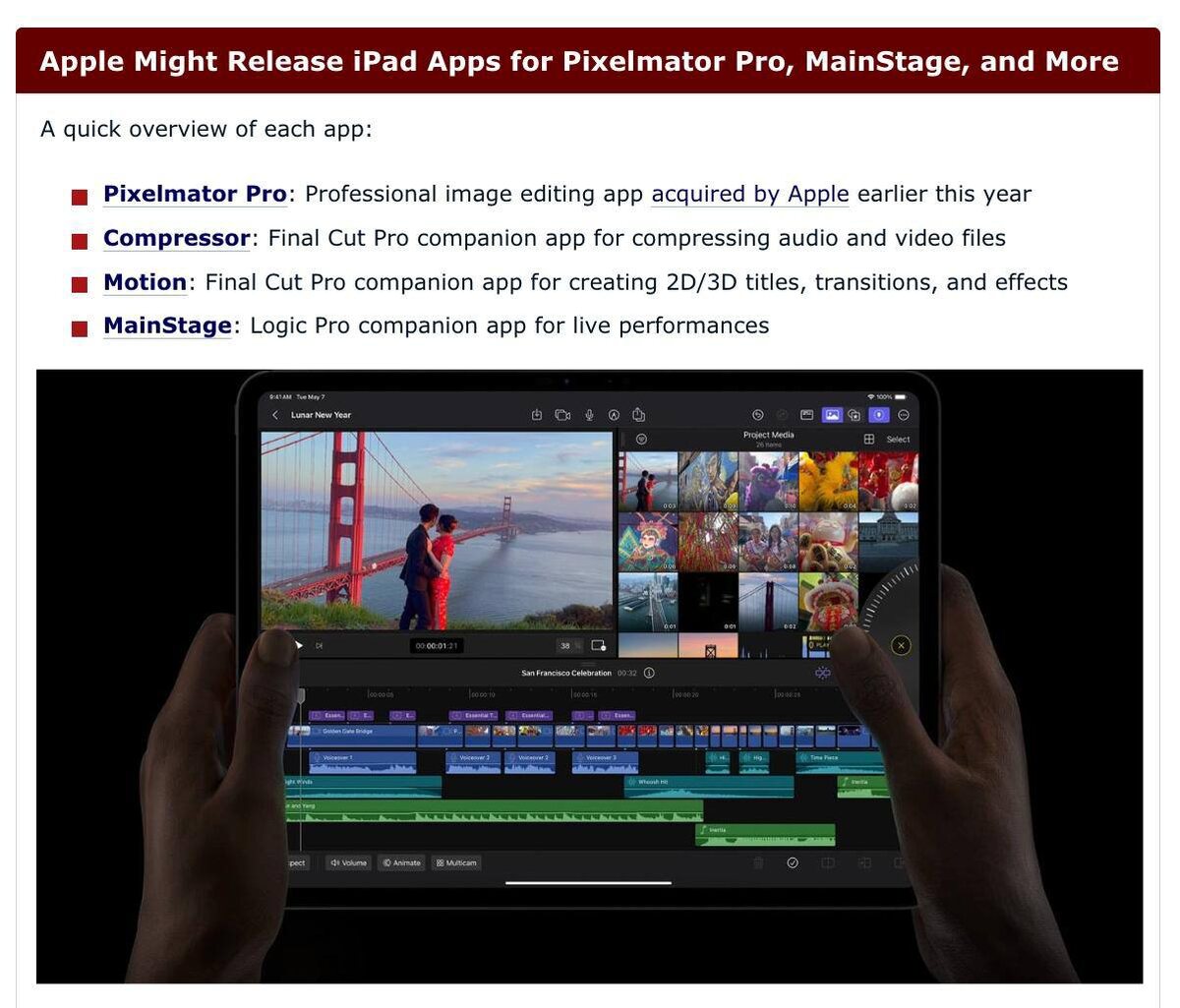 📲 Apple, возможно, готовится запустить четыре новых профессиональных приложения для iPad 📰 Автор MacRumors обнаружил ссылки на несколько новых профессиональных приложений для iPad в файлах App Store. На данный момент эти приложения доступны только на Mac: • Pixelmator Pro • Compressor • Motion • MainStage 👍 Эти приложения расширят текущую линейку профессионального ПО для iPad от Apple, присоединившись к Final Cut Pro и Logic Pro, которые были выпущены для iPad в прошлом году. Официальной даты релиза пока нет, но сроки выхода кажутся логичными — особенно после запуска iPad Pro с чипом M5.