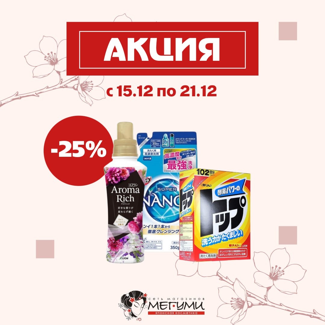 ✨ Только с 15 по 21 декабря! ✨ В магазине Мегуми действует специальная акция: скидка -25% на все средства для стирки из ассортимента японских и корейских брендов! Пусть Ваша одежда сияет чистотой — выбирайте инновационные формулы, деликатные ароматы и безупречный результат ухода. Не упустите выгоду! Гели для стирки, кондиционеры для белья, стиральные порошки уже ждут вас на полках! Акция действует только до 21.12. С другими предложениями и скидками не суммируется. Магазин Мегуми — забота о доме в каждой детали. Ждём вас!