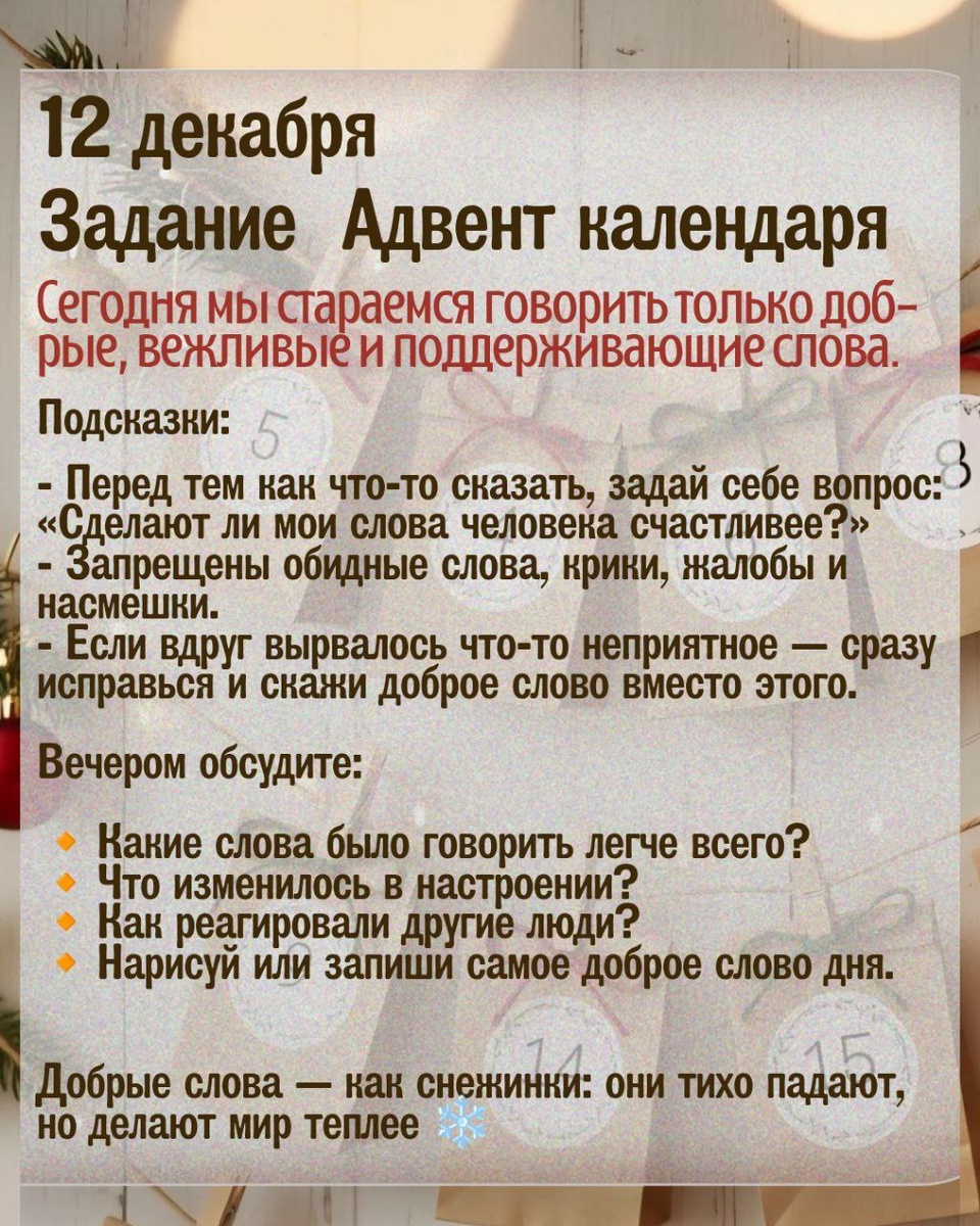 Доброго времени суток дорогие подписчики! Продолжаем радовать наших детей очередным заданием Адвент календаря https://t.me/roditelskiyuniversitet/2289 Направляем вам шестое и седьмое задание. Обязательно поделитесь как вы выполняли задание, своим опытом😉