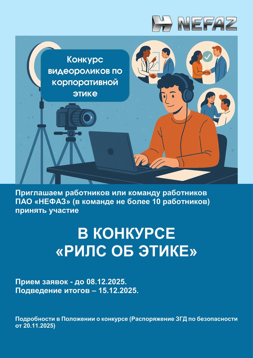 В этом году на «НЕФАЗе» впервые прошел увлекательный творческий конкурс «Рилс об этике»! Задачами конкурса стали: - повышать уровень знаний о требованиях Кодекса корпоративной этики ПAO «НЕФАЗ»; - укреплять культуру этичного поведения среди работников подразделений ПAO «НЕФАЗ»; - вырабатывать умения и навыки этичного поведения у работников подразделений и организаций ПAO «НЕФАЗ». Организатором конкурса выступила группа внутреннего контроля и комплаенс. Для участия принимались оригинальные видеоролики продолжительностью от 15 до 60 секунд, раскрывающие суть корпоративной этики в интересной форме: будь то советы, разоблачение ошибок или забавные сценки. На конкурс зарегистрировались четыре сотрудника ПАО «НЕФАЗ», представив шесть творческих рилсов. Один ролик оказался вне формата и не прошел отбор, согласно пп. 5.5, 5.8 Положения о конкурсе «Рилс об этике». Лучшими работами были признаны: 1-е место - Лиана Сафиуллина, инженер-технолог 3-й категории отдела главного технолога; 2-е место -