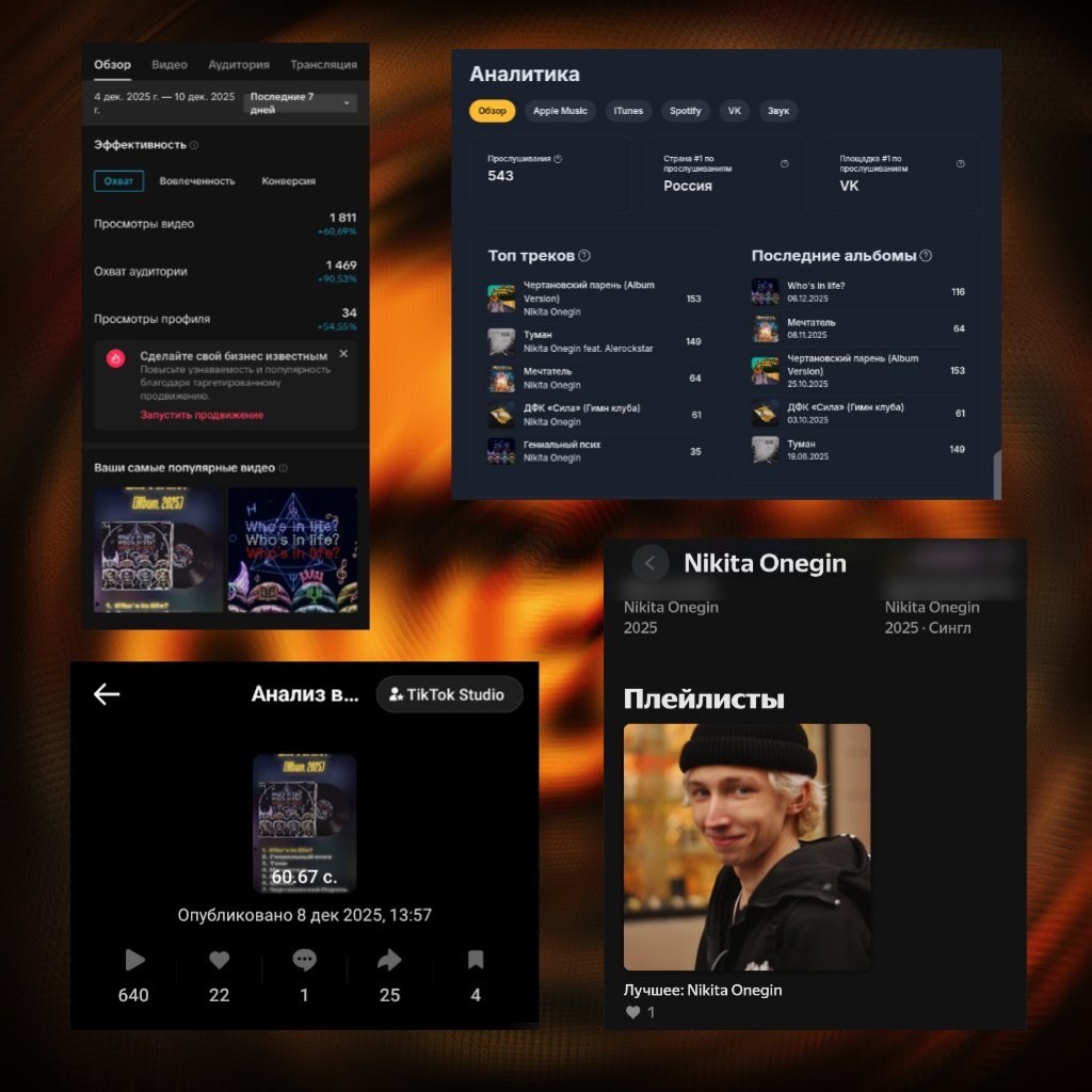 Итаааак, небольшая статистика после выхода альбома📊 🎥Тик Ток — очень важная площадка для начинающих и не только артистов. Именно здесь создаётся будущий тренд/танец/шумиха вокруг релиза. Я конечно же постарался этим воспользоваться. 🎵Яндекс Музыка — создала мне мой первый (надеюсь не последний) плейлист. «Nikita Onegin: Лучшее». По факту, пока что я считаю рановато для такого плейлиста, у меня треков то пока что раз два и обчёлся, а тут ещё и лучшие. Ну ладно, всё равно приятно! ☺️ 🎵VK — больше всего меня слушают именно в ВК Музыке. Удивительно, но факт. 🎶Все площадки — мой альбом набрал первую 100-ку прослушиваний!!! И это за неделю! Интересно, сколько будет дальше? 😜 Теперь оценка по трекам: Самый прослушиваемый — Гениальный Псих Самый недооценённый — Grandma Самый качёвый — Who's in life?