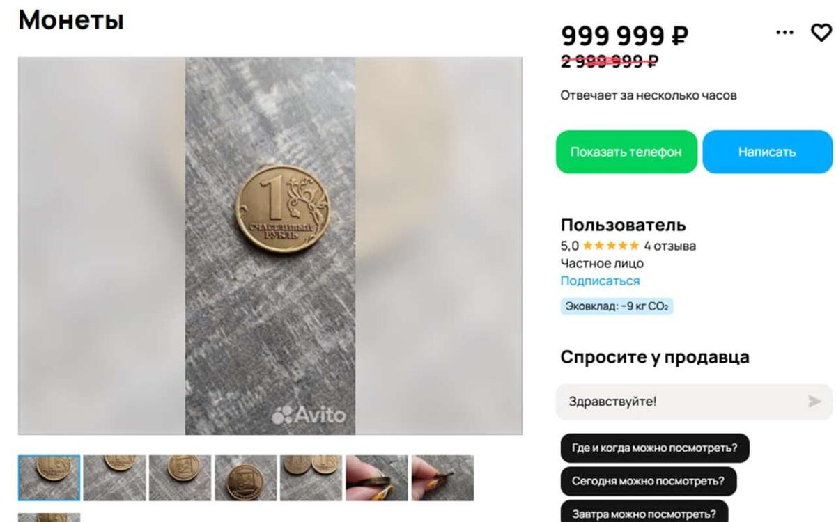 В Воронеже неизвестный продает «Счастливый рубль» за почти 1 млн рублей. Соответствующее объявление появилось на сайте Авито. Автор объявления продает монету «Счастливый рубль». По словам продавца, товар оригинальный и есть только в одном экземпляре. Монета изготовлена из латуни, а по размеру совпадает с монетой, номинал которой 10 рублей. Год выпуска монеты — 2009. — На лицевой стороне «1 Счастливый рубль» на обороте «Все будет хорошо» Центрофинанс и гравировка ЦФ, — говорится в объявлении. За товар продавец просит 999 тысяч 999 рублей. Отметим, что это со скидкой. Ранее монету пытались продать за 2 млн 999 тысяч рублей.