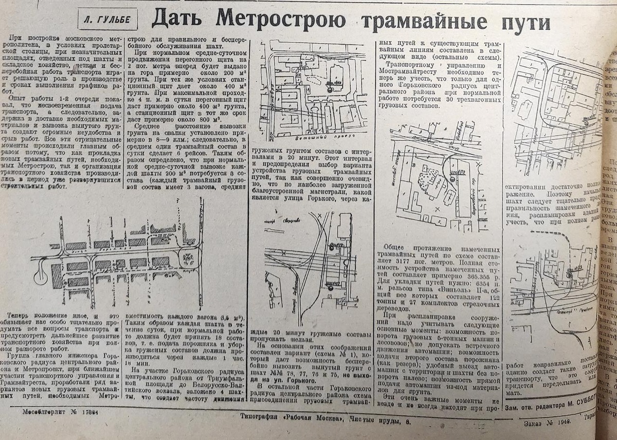 Опыт моих лекций и просветительской работы по строительству первых очередей определил самые частые вопросы, которые задают. Среди них чаще всего фигурирует такой: «Как вывозили грунт с шахт метростроя, если не было грузовых самосвалов большой ёмкости?» Ответ очень прост — грузовыми трамваями. В 20–30 годы прошлого века грузовое движение по трамвайной сети было обычным делом. На конец 1931 года в Управлении московского трамвая находилось 139 грузовых вагона Показываю вам расчёт вывоза грунта на сооружении второй очереди, причём стояла задача не задействовать трамвайные пути по улице Горького, а проложить новую, временную сеть по соседним улочкам. Из статьи видно, что для вывоза с каждой шахты 200 кубометров породы требуется 8 рейсов грузового состава, каждый из которых состоит из трех трамвайных вагонов вместимостью 8,5 кубов.