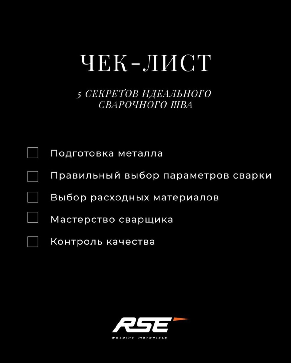 Чек-лист: 5 секретов идеального сварочного шва Идеальный шов – это не только красиво, но и надёжно. Он должен выдерживать нагрузки, соответствовать нормативам и служить столько, сколько задумано конструкцией, а то и больше! 🔧 1. Подготовка металла – Чистая поверхность: отсутствие ржавчины, масла, краски и других загрязнений. Даже небольшое загрязнение может вызвать поры, трещины или непровары. – Правильная разделка кромок (скосы, зазоры). Для толстых металлов требуется V-, X- или U-образная разделка, чтобы обеспечить полный провар. – Надёжная фиксация деталей. Используйте струбцины или прихватки, чтобы избежать смещения при сварке. ⚙️ 2. Правильный выбор параметров сварки – Ток и напряжение должны соответствовать типу металла, его толщине, диаметру электрода или проволоки и положению шва. Малый ток даст слабое проплавление, слишком большой – прожоги и брызги. – Скорость сварки. Очень быстро – непровар; слишком медленно – прожог или чрезмерное наплавление. – Полярность (DC+, D
