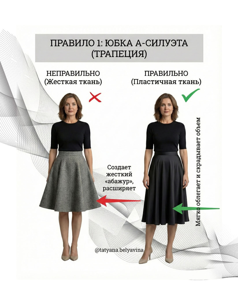«У меня тяжелый низ...» 😩 Приговор или повод научиться одеваться? Хватит прятать бедра в балахоны! Коррекция фигуры — это чистая геометрия. Вы можете визуально сбросить 5-7 кг, просто сменив фасон. Сохраняйте 7 приемов для женственного силуэта! 📌 1️⃣ Ошибка «Абажур» (А-силуэт) Все знают, что А-силуэт скрывает бедра. Но есть нюанс! ⛔️ Жесткая ткань (плотный джинс, твид) встанет колом и превратит вас в массивный треугольник. ✅ Пластичная ткань (вискоза, тяжелый шелк) мягко обтечет бедро и скроет объем движением фалд. 2️⃣ Прощай, «морковка»! Любите зауженные брюки? Зря. ⛔️Сильно зауженные брюки/джинсы превращают ноги в морковки, а бедра на контрасте кажутся огромными. ✅ Ваш выбор: Палаццо или прямые брюки в пол. Они создают вертикаль и «стирают» бока. 3️⃣ Закон Весов, если низ кажется тяжелым, верху не хватает объема. ✅ Добавьте «воздуха» наверх: рукава-буфы, подплечники, вырез «лодочка». Уравновесьте плечи — и бедра перестанут доминировать. 4️⃣ Зона тишины Самая широкая часть бедер