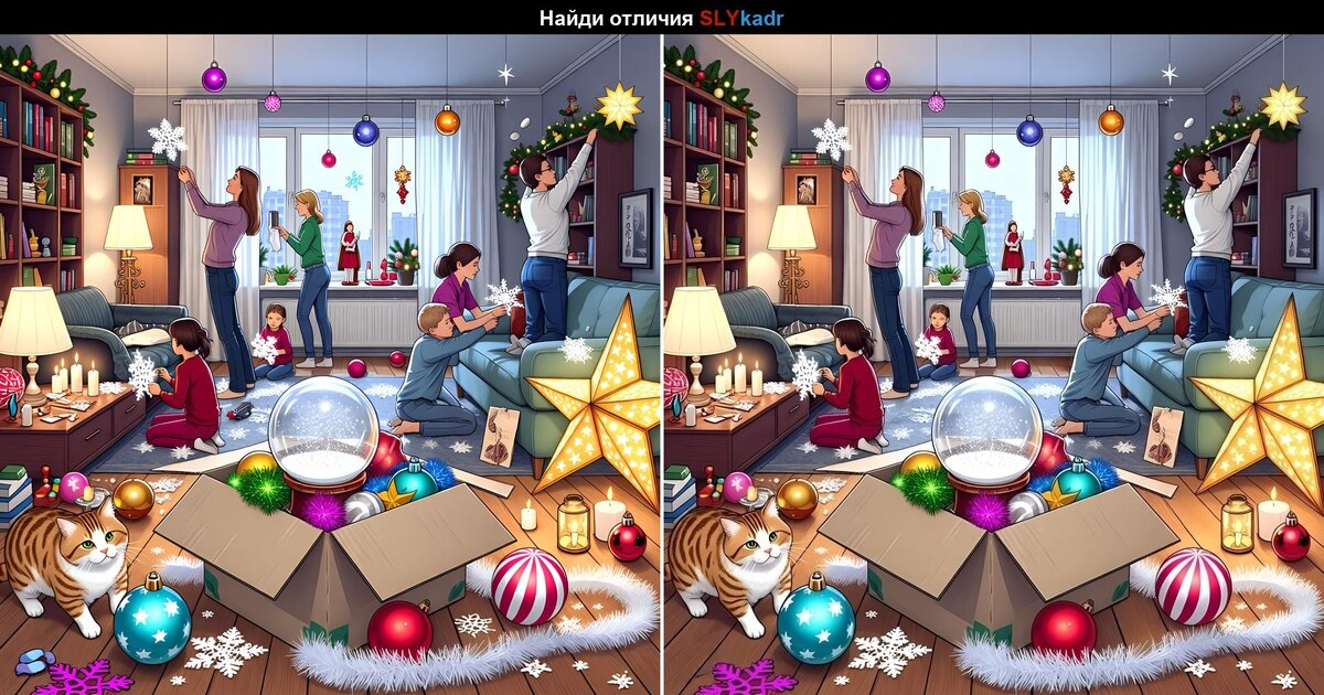 Привет, друзья! В этот волшебный сезон мы приглашаем вас немного отвлечься от праздничной суеты и проверить свою внимательность! Сегодня перед вами новогодняя сцена с уютным украшением дома. Но внимание — здесь скрыто несколько отличий, которые вам нужно найти. Готовы к вызову? Тогда не теряйте времени — давайте начинать! Поздравляем, если вы нашли все отличия! А если что-то ускользнуло, не переживайте — попробуйте снова! Поделитесь результатами в комментариях и пригласите друзей проверить свою внимательность. Следите за новыми задачами на канале "Хитрый кадр". До новых встреч и веселых праздников! Отгадка ниже. 🎄🎉