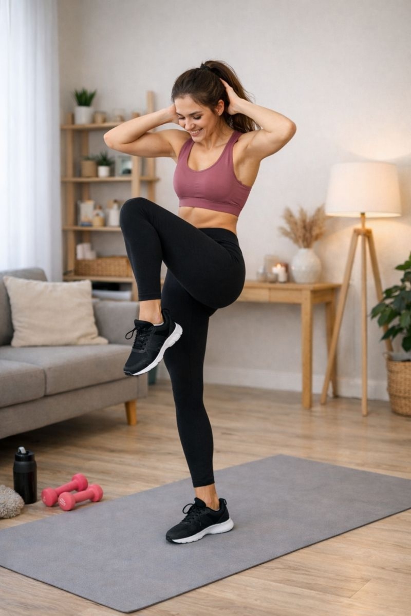 - Из положения стоя дотянуться коленом к противоположному локтю, потом другим коленом к другому локтю.