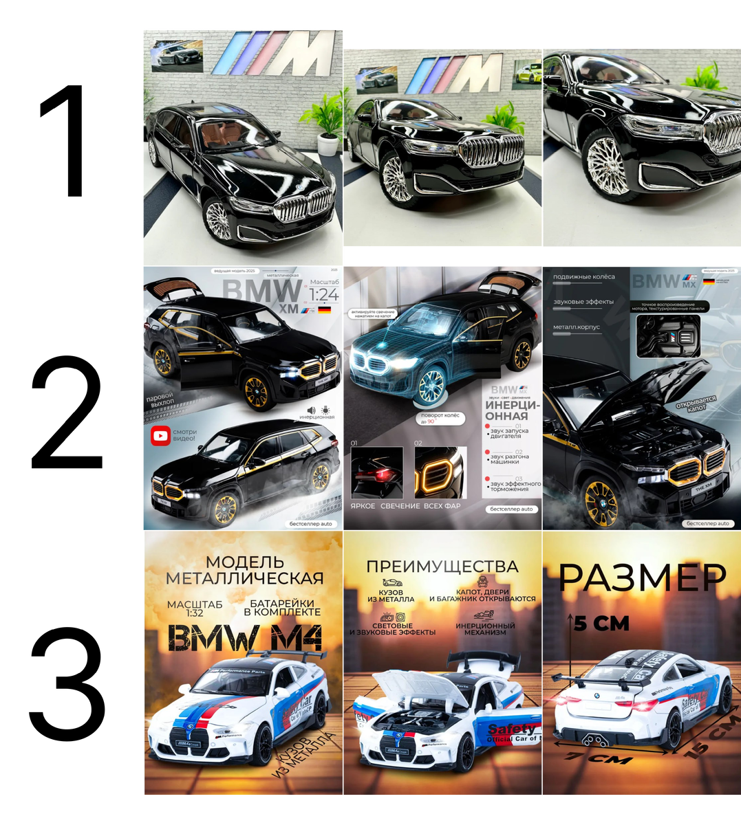 До Нового года 2 месяца, начинается сезон покупки подарков. Будем много разбирать таких товаров, у которых сейчас самый сезон. Сегодня маленькие машинки - копии настоящих BMW. В маленькой модели повторяют то, что есть в большой. Есть коллекционеры, которые собирают разные модели. Но покупают и просто детям. Эти машинки достаточно большие, в масштабе 1:24, есть намного меньше, их уже больше именно коллекционеры берут. А этими сможет играть и ребенок. Цены: карточка 1 - 1451 руб, карточка 2 - 1556 руб, карточка 3 - 1141 руб. Продажи на Озон: 11 тыс, 66 тыс, 836 тыс. Доп.фото в комментариях. Какая машинка продается лучше? В комментариях под этим постом можно посмотреть полные воронки этих карточек. Пока вы размышляете, можно посмотреть опрос в моем ТГ канале Готовы. Теперь разберем...