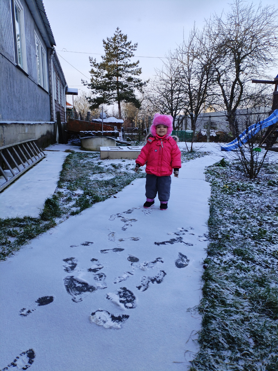 В палисаднике Амелька свои следы изучала. Вышла, дорожка белая. Она аккуратно так по ней идет, оглядывается, и удивляется: "Вооо". Показывает на следы.