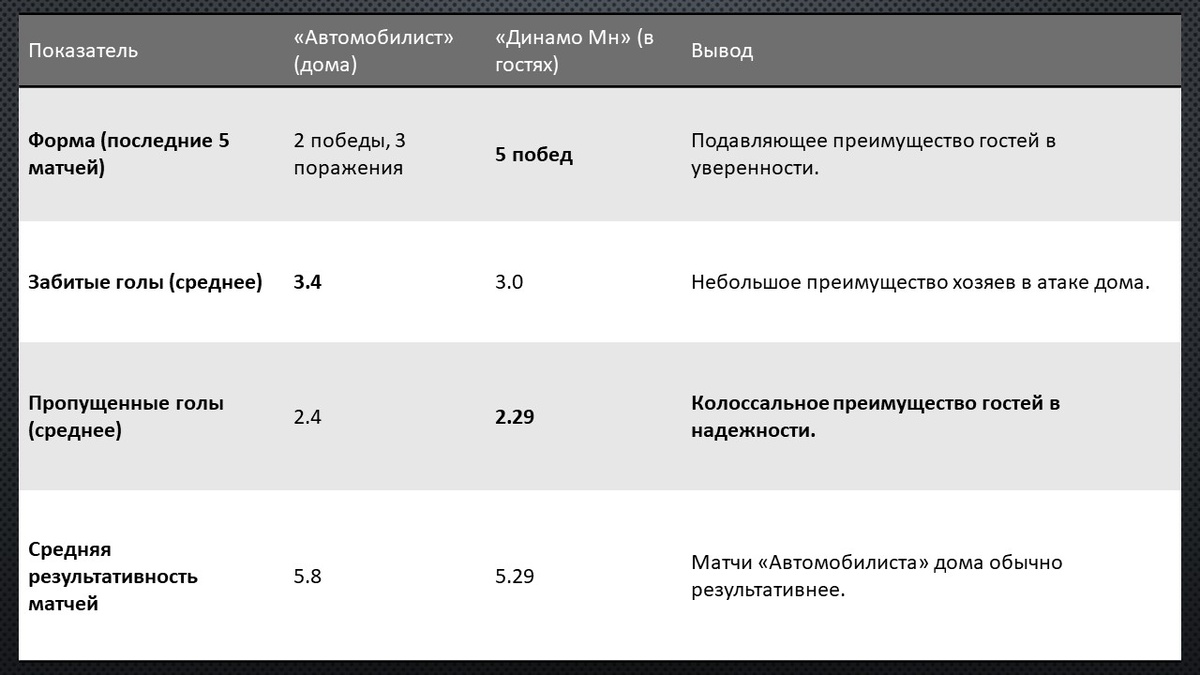 - Победа «Динамо Мн» с учетом их надежности (Вероятность ~45%). Гости своей дисциплинированной игрой «засушат» атаку «Автомобилиста», не дадут ему разогнаться и, использовав свои шансы, добьются минимальной, но уверенной победы. Учитывая их оборонительную статистику, этот сценарий предполагает низкий общий тотал голов (менее 5.5).