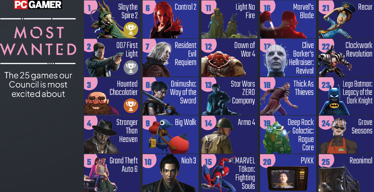 На шоу PC Gaming Show: Most Wanted, организованном одним из известных в мире самых игровых СМИ составили список самых ожидаемых игр. Slay the Spire 2 Если игры здесь расположены в порядке ожидания, то я полностью согласен. Первая часть Slay the Spire - это лучший карточный рогалик, в который я играл. Эта игра попросту идеальна. 007 First Light Очень интересный проект. История молодого Джеймса Бонда в стиле игр серии Uncharted. Haunted Chocolatier Симулятор шоколатье от создателя культовой Stardew Valley. По большому счету жанр и сеттинге тут не так важен как имя разработчика. Stranger Than Heaven Новый приключенческий боевик от создателей серии Yakuza, выполненный в похожем стиле, но с примесью японского нуара в сеттинге. Grand Theft Auto 6 Очевидный участник любых списков за любым авторством, касающихся самых ожидаемых игр. Control 2 На момент составления списка еще не было известно, что на самом деле новая часть серии будет называться Control Resonant и теперь главным герое