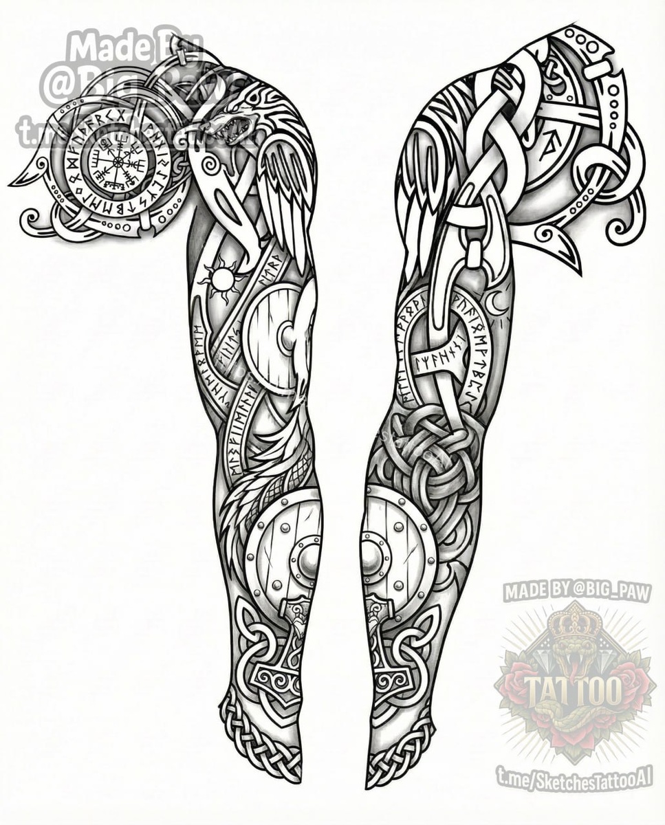 #2849 Подборка по запросу подписчика - Можно что-то типа такого, только полноценный эскиз сделать? 😎 Ранее уже писал, что лучше чем этот дизайн через нейросеть не сделать 🎩 🧠 SYNTX - тут создан эскиз 💎 Информация - все услуги 💀 Эскизы от нейросети #рукав #узоры #эскиз #тату #татуировка