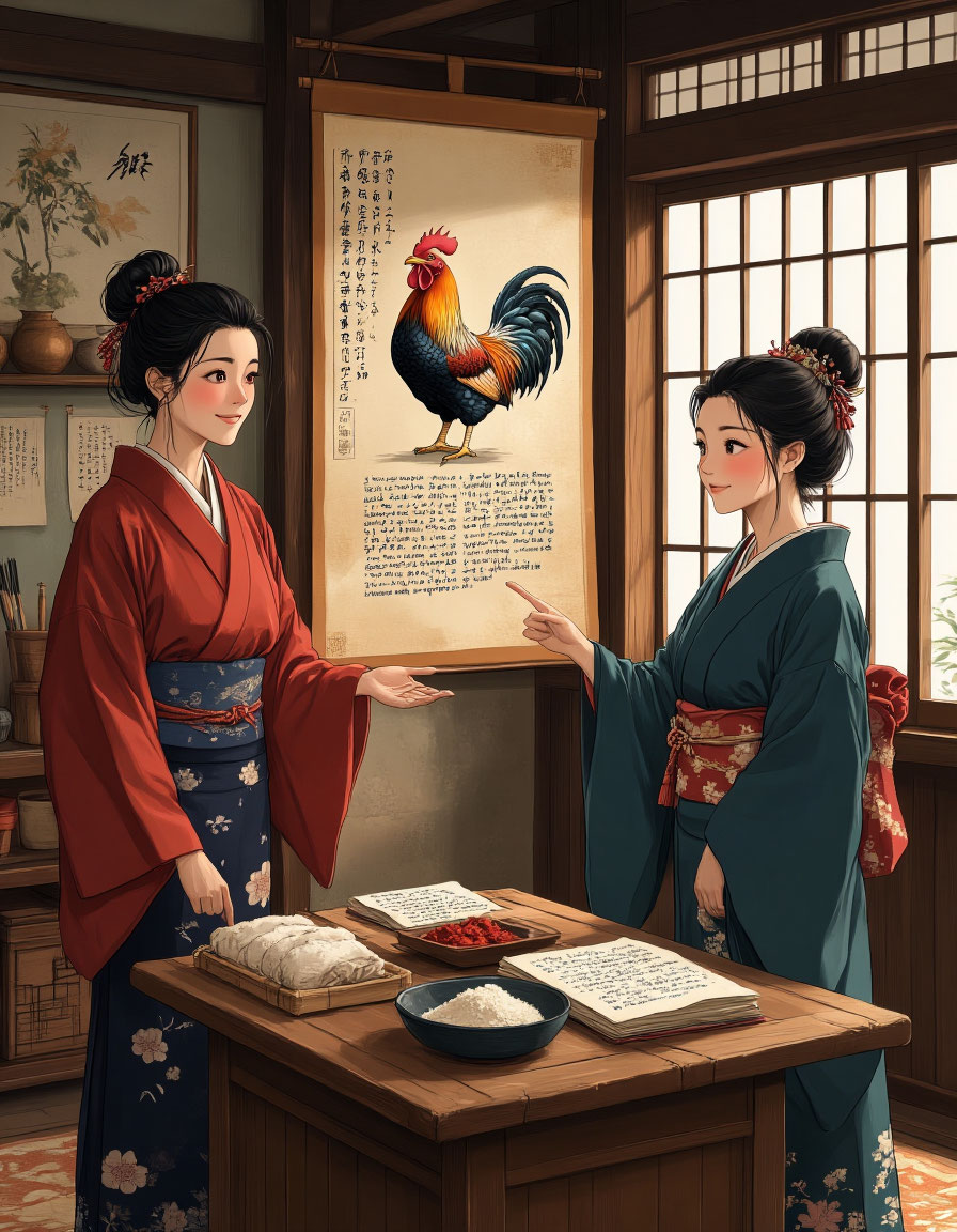 *из рассказов местных жителей. Подборка и перевод - мой. Отправился как-то раз торговец в столицу Эдо продавать особые красители для тканей. Остановился он на ночь в одной придорожной гостинице. Хозяйка, женщина хитрая и речистая, указала ему на старый свиток, висевший в углу комнаты. — Гость дорогой, — сказала она, — а свиток у меня не простой. Петух, что на нём изображён, каждое утро поёт, как живой, возвещая рассвет. — Не может того быть! — рассмеялся купец. — Разве бывает, чтобы нарисованная птица пела? — Что ж, — лукаво улыбнулась хозяйка, — давай поспорим. Если завтра петух пропоёт — весь твой товар мой. Если же нет — я заплачу тебе его полную стоимость. Согласился купец, уверенный в своей правоте. Но наутро, едва первые лучи солнца коснулись бумажного свитка, петух громко и победно пропел «ку-ка-ре-ку!». Обескураженному торговцу пришлось оставить все свои тюки с цветами и с пустыми руками возвращаться домой. Выслушала его жена горький рассказ, не проронив ни слезинки. — Не печа