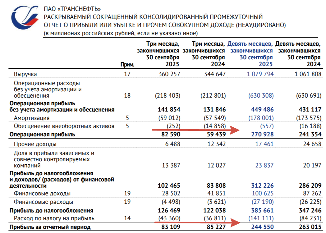 Транснефть представила финансовые результаты по МСФО за III квартал и 9 месяцев 2025 г. Компания хорошо отработала III кв. (РФ начала наращивать добычу нефти со II кв., но и налог на прибыль увеличился до 40%), выручка и опер. прибыль второй квартал подряд вышли в плюс по году (в I кв. такого не было). Скоррект. чистая прибыль снизилась по сравнению с прошлым кварталом, но FCF положительный и знатно подрос: 🛢 Выручка: III кв. 360,3₽ млрд (+4,5% г/г), 9 м. 1,079₽ трлн (+1,7% г/г)