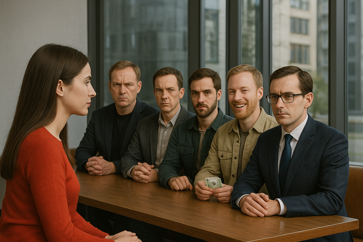 Вера, амбициозная и изобретательная, решила, что её новая дизайнерская сумка за 25 000 рублей не будет ждать. Она разработала "План Свиданий" — семь встреч с семью разными мужчинами. Каждому она задавала один и тот же вопрос: "Мне срочно нужно 5000 рублей. Поможешь?" Её целью было собрать нужную сумму, а её экспериментом — изучить мужскую реакцию. Первым был Игорь, педантичный IT-специалист, в стильном, но недорогом баре. Вера: "Дорогой, мне очень нужно 5000 рублей прямо сейчас." Игорь побледнел, затем побагровел. "Это отвратительно и неэтично! Ты пригласила меня на свидание ради денег? Я заплачу за свой коктейль, и мы на этом закончим!" Он вскочил и ушёл, оставив Веру с чувством сильного унижения. Следующий, банкир Павел, встретил её в кофейне. Он был вежлив, но аналитичен. Вера: "Паша, я должна попросить об одолжении. Мне очень нужна твоя помощь, 5000 рублей." Павел разочарованно покачал головой. "5000 рублей — это не экстренная сумма. Это похоже на манипуляцию, или тест. В любом сл