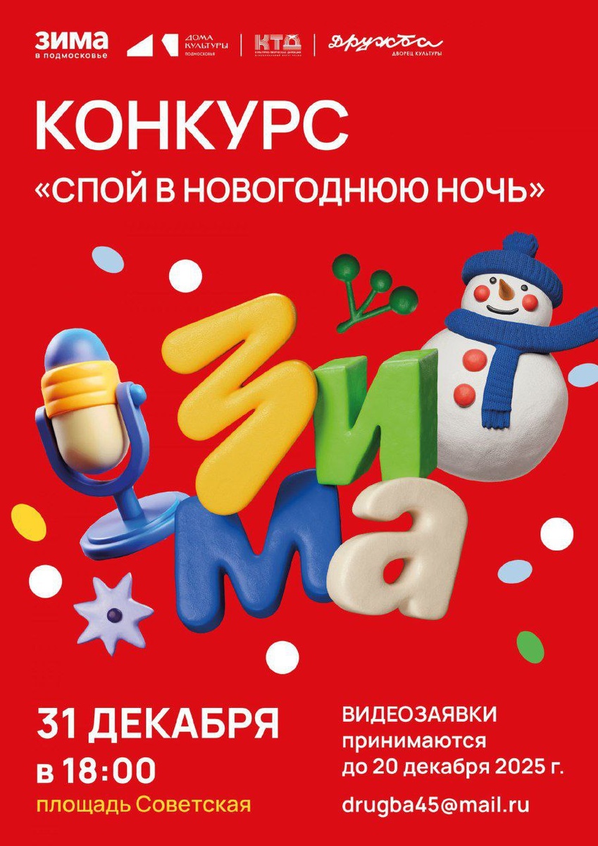 Дворец культуры "Дружба" нашего города объявляет конкурс среди жителей и гостей Чехова "Спой в новогоднюю ночь"! Вы умеете петь и уверенно чувствуете себя на сцене? У вас есть желание поздравить всех жителей нашего города с Новым годом? Тогда вам точно стоит поучаствовать в данном конкурсе! Условия максимально просты! Вам всего лишь нужно снять видео своего исполнения новогодней песни и отправить на нижеуказанную почту с обязательным указанием своего контактного телефона, имени и возраста (❗️возраст участников конкурса строго 16+)!👇🏼 drugba45@mail.ru Видео заявки принимаются до этой субботы! Не упустите свой шанс стать звездой новогоднего вечера—выступить на главной сцене города на Советской площади 31 декабря в 18:00 и получить приз за свои старания! Вход свободный!