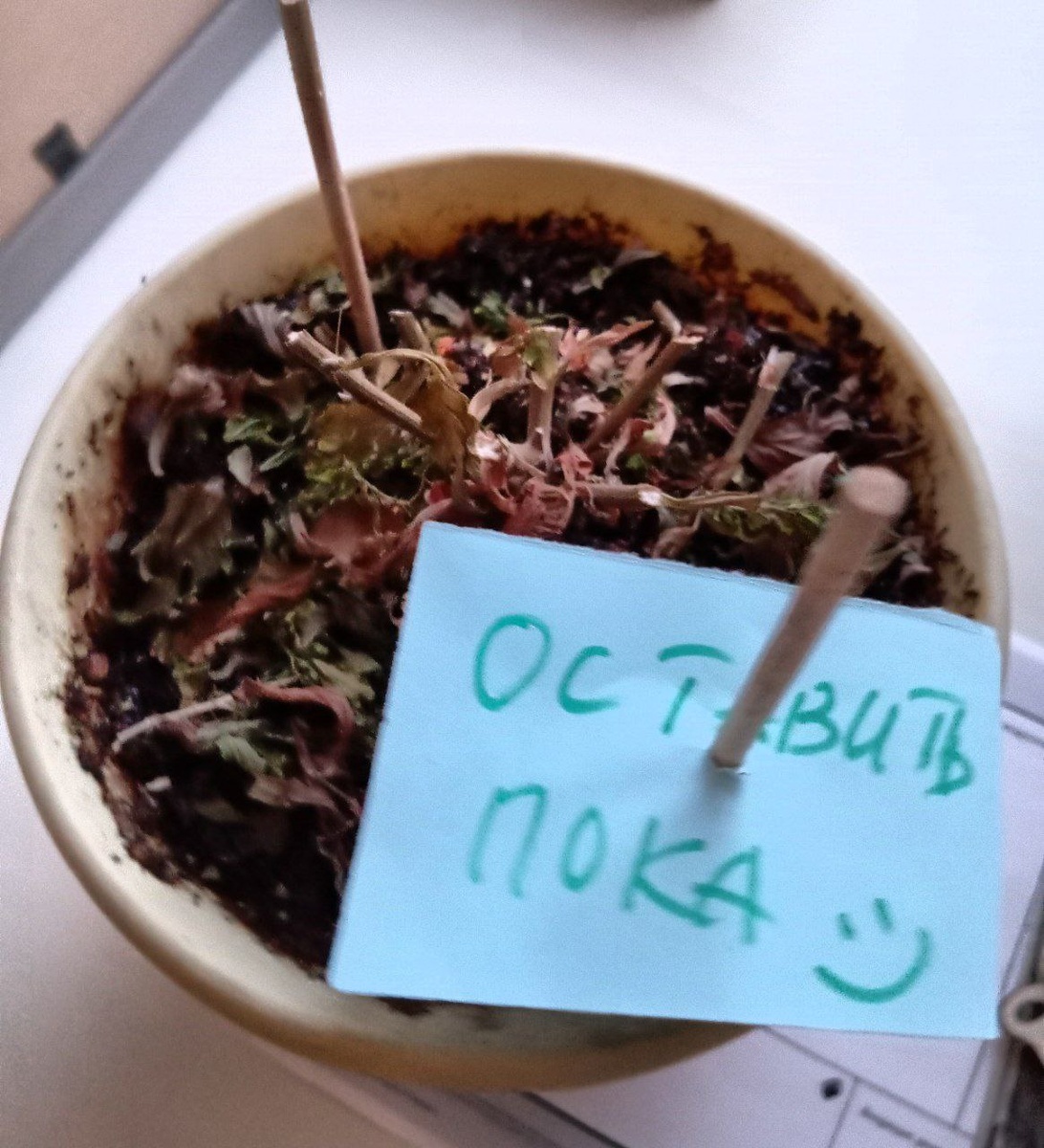 Способность некоторых организмов выживать — удивляет и восхищает. Кого-то, наверное, и раздражает тоже. Готовясь возвращать очередной долг своему организму, несколько дней собираю медицинские документы. Разумеется, проглядываю, что-то прочитываю. После слова «перенёс» удивляюсь — ведь ничего особенного не делал, чтобы перенести. Скорее «сдюжил», оказался достаточно крепким, такое у этого слова значение. Отлично стал понимать и чувствовать выражение «что не убивает, делает сильнее». Когда что-то происходит неладное, что-то идёт не по плану, накапливается и хочется от этого всего в петлю лезть, я чувствую что-то, что заметил, видимо, автор записки, и внутренне говорю себе — «Оставить пока». И смайлик мысленно ставлю. Потому что никак без смайлика в этом всём. Легко любить пышное, зелёное, нарядное растение. Особенно, когда цветёт и плодоносит. Попробуй зимой любить торчащий из голой земли безжизненный стебель, верить в его силу, силу корней, силу истинной природы — и по вер