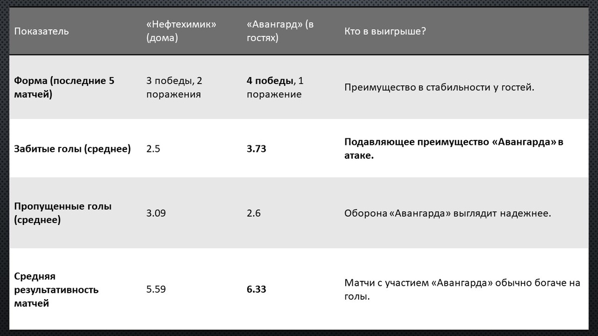 - Атакующая мощь и стабильность: «Авангард» — одна из самых результативных команд лиги, забивающая в среднем 3.44 гола за матч. На выезде этот показатель еще выше — 3.73. Команда находится в прекрасной форме: 4 победы в последних 5 турах, а в гостях они забивают в среднем рекордные 4.33 гола за игру.