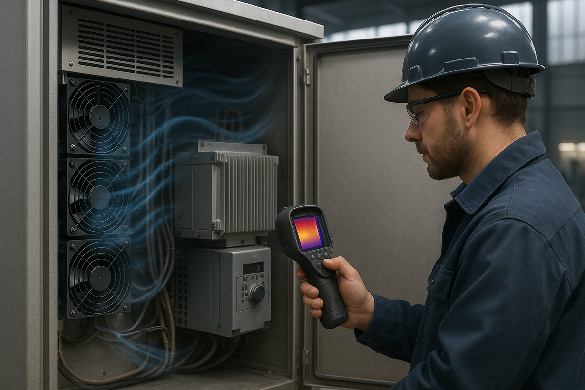 Недостаточное отведение тепла в электроустановках приводит к ускоренному старению изоляции, ложным срабатываниям защит, деградации контактов и отказам оборудования; поэтому управление тепловыми режимами — обязательный элемент эксплуатации электрооборудования, предусмотренный ПУЭ (необходимость удаления избыточной теплоты). Перед оптимизацией охлаждения обязательно измерить фактические температуры на ключевых элементах (силовые компоненты, контакты, трансформаторы, частотные преобразователи) под нагрузкой. Локальные горячие зоны часто указывают на переходные сопротивления, фазную несимметрию или перегрузки, устранение которых снижает тепловыделение и нагрузку на систему охлаждения. Свободный воздухообмен внутри и вокруг шкафа повышает теплопередачу за счёт естественной конвекции (воздушное охлаждение). Эффективно размещённые вентиляционные решётки и каналы создают путь для прохождения воздуха, что снижает ΔT (разницу температур между внутри и окружающей средой).
