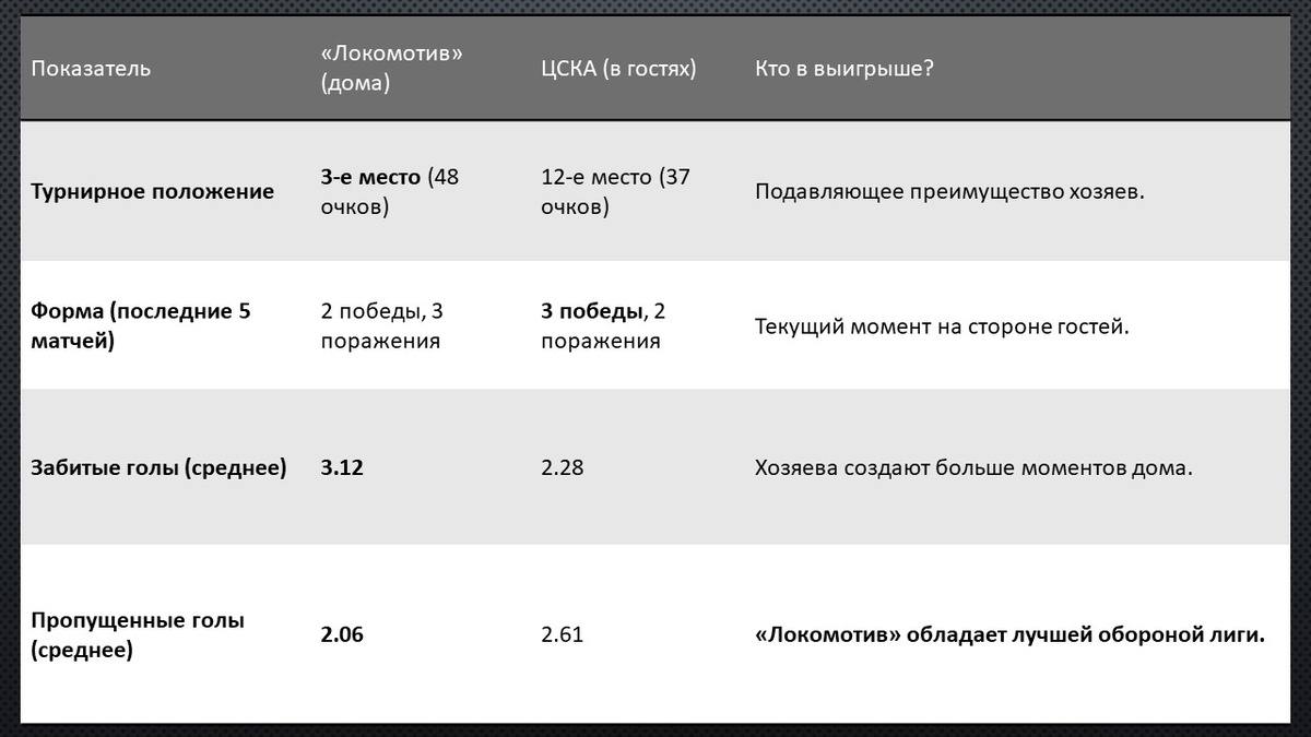 Исход матча, скорее всего, решится в противостоянии атакующих линий ЦСКА и оборонительной системы «Локомотива». Смогут ли армейцы, с их невысокой результативностью в гостях, найти брешь в самой крепкой обороне лиги? Особенно важным будет третий период, где «Локомотив» традиционно силен (1.18 гола дома в среднем) и может решить судьбу встречи. Для ЦСКА же будет критично не позволить хозяевам раскрыть свою игру и навязать жесткий, может быть, даже скучный хоккей.