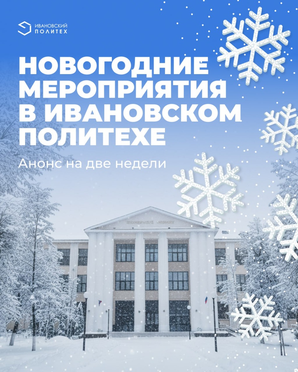 » Собираем сладости для детей. В приоритете это пирожные Барни. Так-же можно поучаствовать и материально (деньгами), в дальнейшем будет закупка конкретных товаров, которые необходимы для повседневной жизни ребят. Обращаться к Анне Лыловой 16 декабря «Новогоднее музыкальное бинго» Участникам мероприятия предлагается просто прослушивать композиции, и зачеркивать их на своём бланке, первый кто соберет выигрышную комбинацию награждается сладким подарком в преддверии нового года. Мероприятие для студентов ИВГПУ. 📍ГШ-235,16:00 22.12.2025 – 17.02.2026 Книжная выставка «Новогоднее настроение» 📍Пространство «Коворкинг» в библиотеке учебного корпуса 23 декабря Новогодний квартирник «Танцы, ёлка, Политех!» Это Новогодняя студенческая программа для иностранных и российских студентов ИВГПУ и студентов Ивановского политехнического колледжа. Творческие номера от институтов, новогодние конкурсы и зажигательные танцы, вот, что станет основой этой программы. 📍ГШ-333, 16:00 24 декабря Тождеств
