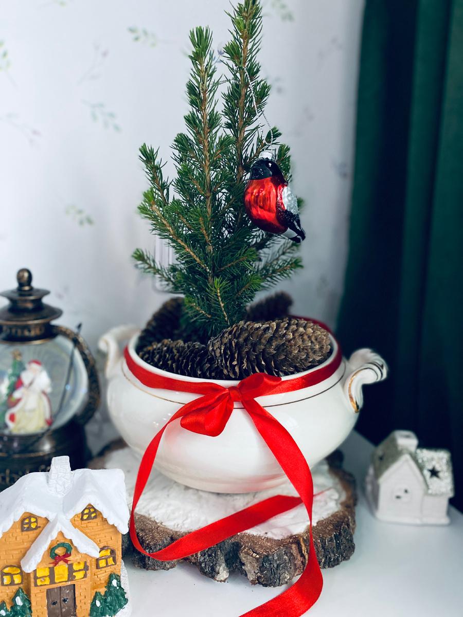 Нашла в запасах алую ленту, а супницу засыпали шишками. Нам тут однажды выдали немножко снега, и мы ушли на весь вечер гулять в ближайший сквер. Там шишек и набрали.