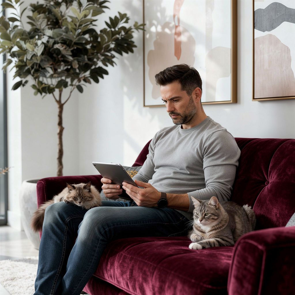 На фотографии 1 (укажите, что это исходное фото интерьера) необходимо создать композицию с человеком (фото 2). Человек должен сидеть в расслабленной позе на диване (как указано на фото 1). Важно, чтобы поза человека соответствовала контурам дивана, и создавалось впечатление, что он действительно на нем сидит. В руках у человека телефон или планшет (создайте его, если необходимо). Человек должен выглядеть удивленным и немного смеющимся, как будто он читает что-то интересное в телефоне