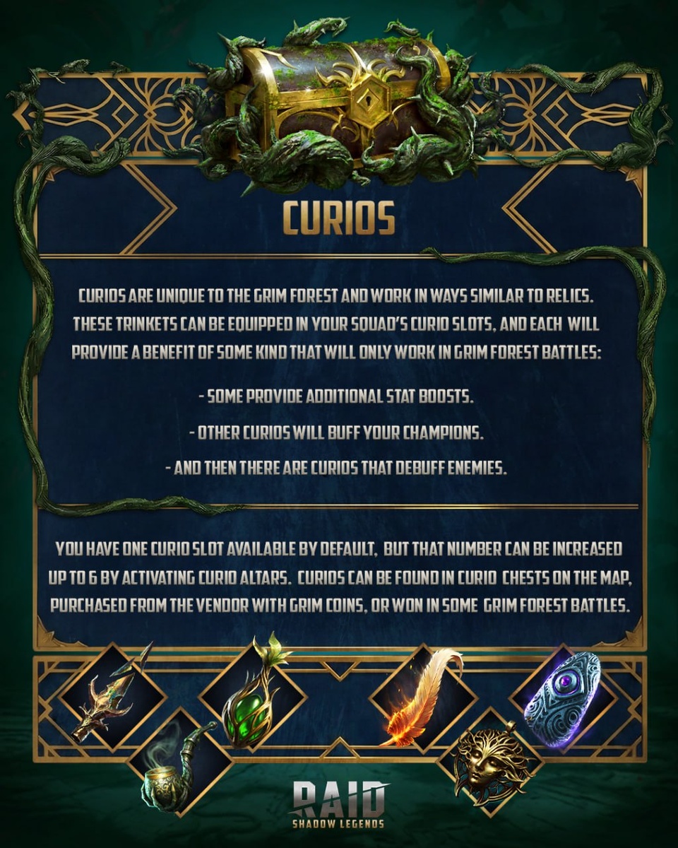 Диковинки Диковинки уникальны для Мрачного леса и работают аналогично реликвиям. Их можно экипировать в слоты для диковинок вашего отряда, и каждый из них предоставит определенное преимущество, которое будет работать только в битвах Мрачного леса: - Некоторые дают дополнительные повышения характеристик. - Другие диковинки усиливают ваших чемпионов. - А есть диковинки, которые накладывают ослабления на врагов. По умолчанию у вас есть один слот для диковинок, но это число можно увеличить до 6, активировав алтари диковинок. Диковинки можно найти в сундуках на карте, приобрести у торговца за мрачные монеты или получить в некоторых битвах Мрачного Леса.