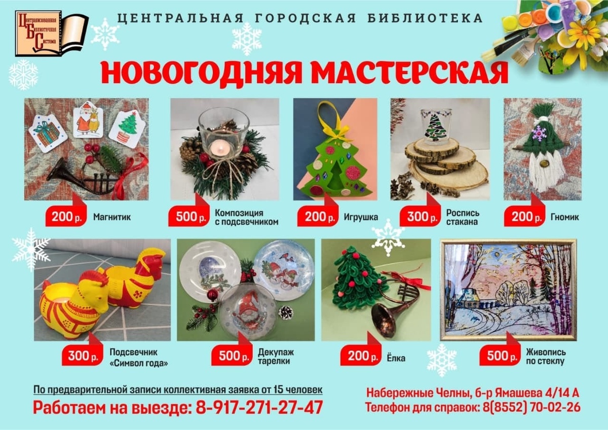 В преддверии новогодних праздников в отделе искусств Центральной городской библиотеки пройдут мастер-классы для тех любит дарить необычные подарки и делать оригинальные вещи своими руками. Приглашаем провести новогодние каникулы с нами. Работаем на выезде.