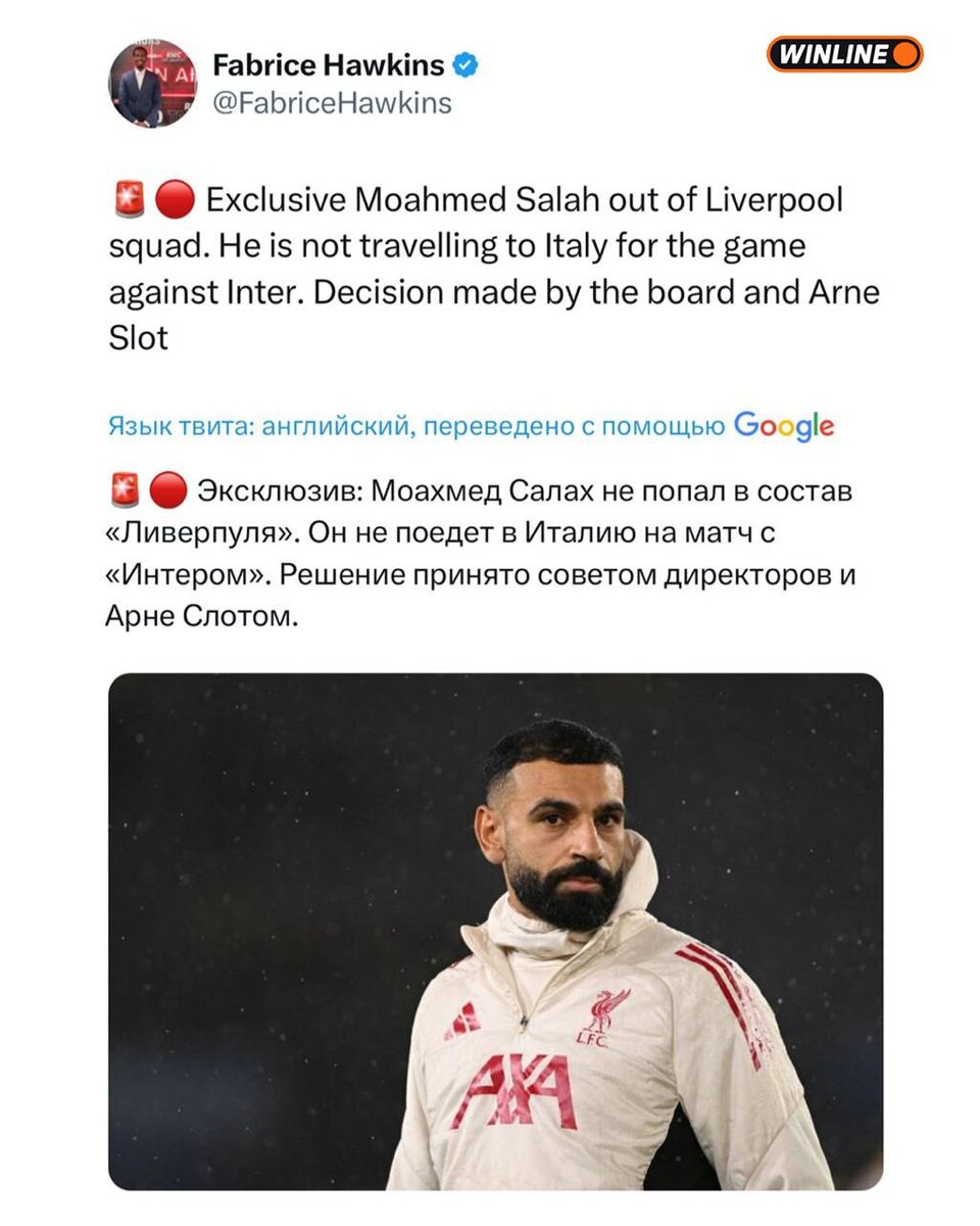 ⚡️👑 Салах исключен из заявки Ливерпуля на матч с Интером — Фабрицио Романо, Фабрис Хоукинс