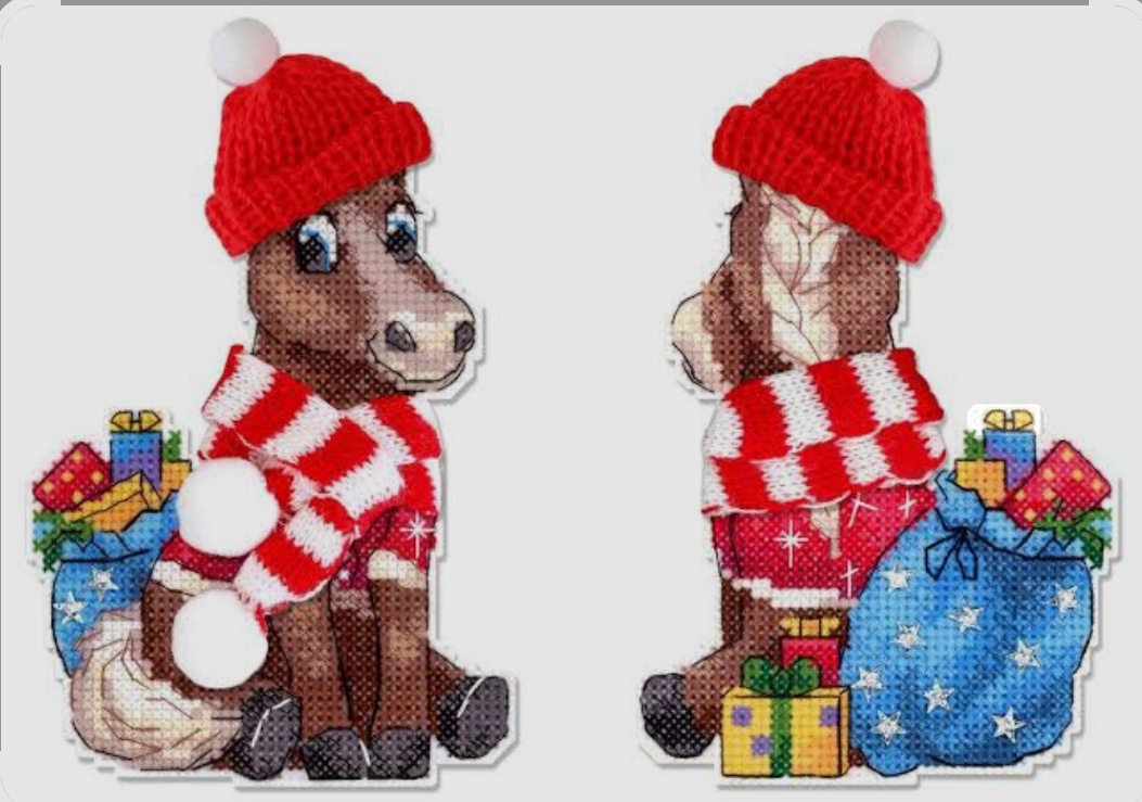 С недавних пор я вышиваю по одному символу предстоящего нового года от "Жар- птицы". Выбор пал на милейшую лошадку в вязанной шапке.