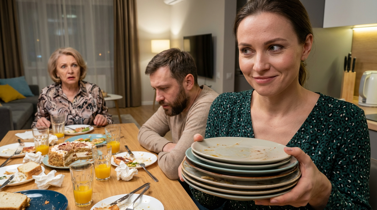 Полина застыла с стопкой грязных тарелок в руках. Внутри нее что-то оборвалось. Та тонкая нить терпения и воспитания, которая сдерживала ее все эти годы, лопнула с оглушительным звоном. Она медленно поставила тарелки обратно на стол.