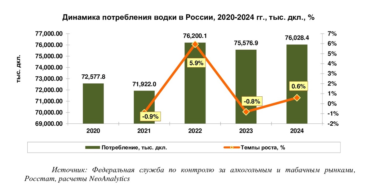 В ходе исследования, проведенного NeoAnalytics на тему «Российский рынок водки: итоги 2024 г., прогноз до 2028 г.», выяснилось, что по итогам 2024 г. общий объем потребления водки в России увеличился всего на 0,6% относительно аналогичного показателя годом ранее и составил 76 млн. дкл. В 2024 г. сформировалась положительная динамика роста объемов потребления после сокращения в 2023 г. В 2021 г. также отмечалась негативная динамика. В последние три года потребление держится на уровне 75-76 млн. дкл. в год. В 2020-2021 гг. объем был – 71-72 млн. дкл. В целом темпы динамики потребления водки не такие интенсивные по сравнению с другими алкогольными напитками. Помесячная динамика периода январь-декабрь 2023-2024 гг. показывает, что фактор сезонности влияет на динамику потребления. Так, пики потребления приходятся на декабрь, в январе объем идет на спад. В 2024 г. также рост объемов отмечался в мае и августе в то время, как год назад в этот же период потребление просело. Сегодня в общей ст