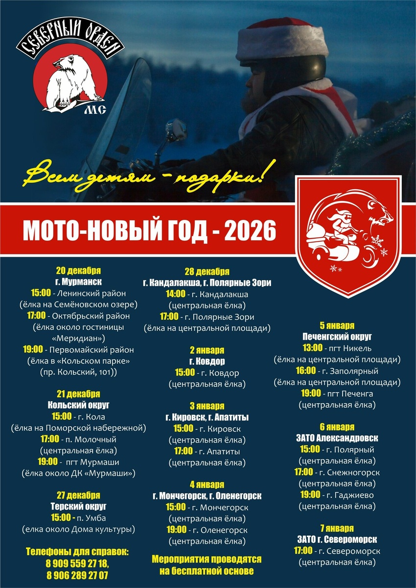 🔁 Дальняк.рф™: Дорогие друзья! Мы готовы поделиться двумя радостными новостями! ❗ Первая - Мы в этом году впервые в Терском округе! Встречаемся в п. Умба на елке около Дома культуры накануне Нового года! ❗ Вторая - готово полное расписание Мото-Нового года, а это значит, что совсем скоро мы увидим искрение глаза и улыбки детей! Ух, как же мы этого ждем!!! 🎄⛄