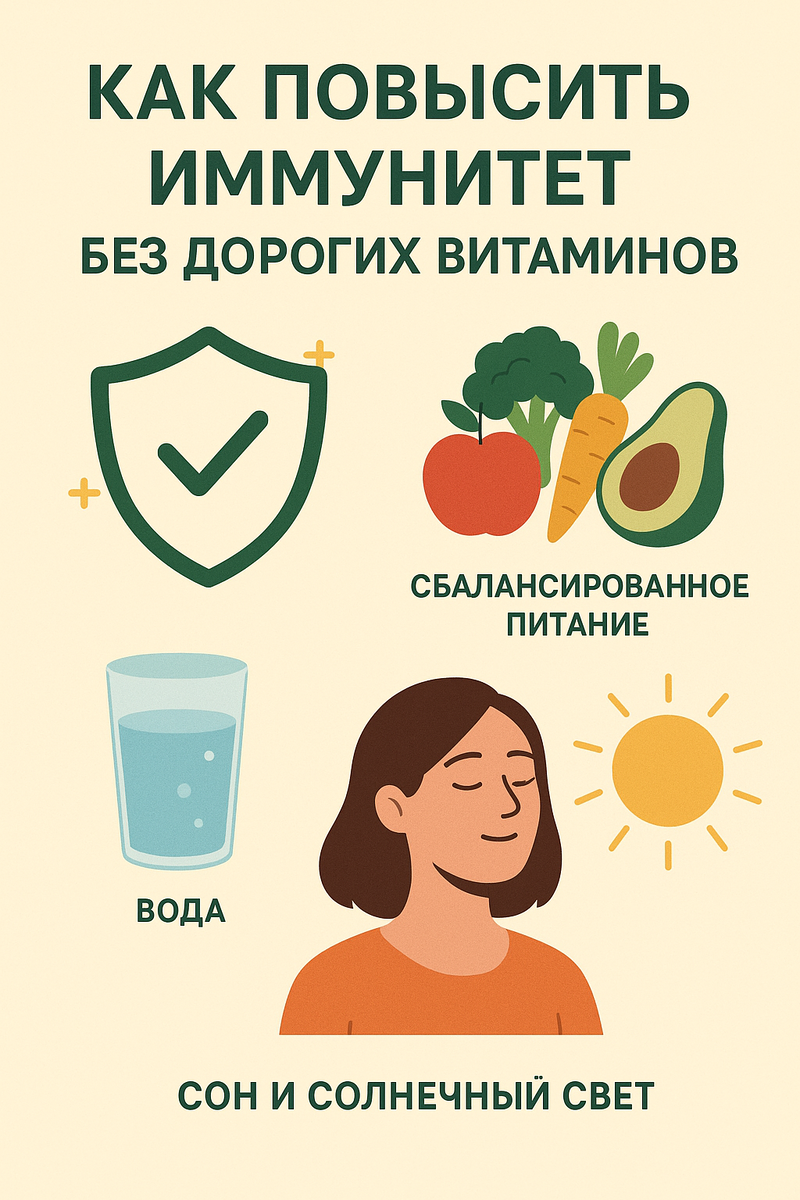 Иммунитет - это наша внутренняя система защиты 🛡️. Многие считают, что для её укрепления нужны дорогие витамины и БАДы, но на самом деле основа здоровья - в простых и доступных привычках. Разберёмся, как поддержать иммунитет без лишних затрат 💚 🥗 Сбалансированное питание Наш организм получает всё необходимое именно из еды. Для крепкого иммунитета особенно важны: Овощи и фрукты 🍎🥦 - источник витаминов и антиоксидантов Крупы и бобовые 🌾 - дают энергию и микроэлементы Белок (яйца, рыба, мясо, бобовые) 🍳🐟 - помогает формировать иммунные клетки Чем разнообразнее рацион, тем лучше работает защитная система организма. 💧 Вода - недооценённый помощник Достаточное количество воды помогает выводить токсины и поддерживает все обменные процессы 🚰. Даже лёгкое обезвоживание может снизить сопротивляемость организма. 😴 Качественный сон Во время сна организм «чинит» себя 🧠✨. Если регулярно недосыпать, иммунитет ослабевает. Старайтесь спать 7–9 часов и ложиться в одно и то же время. 🚶♀️