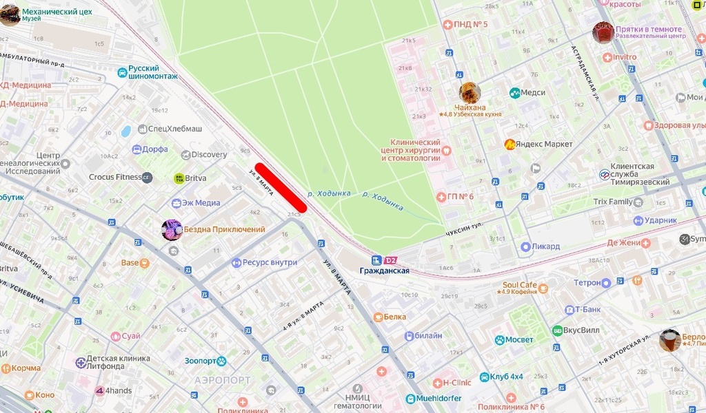 Тем не менее, нельзя не отметить близость крупных дорожных артерий. В полукилометре южнее проходит Ленинградский проспект – оживлённое и шумное шоссе, особенно в часы пик. С восточной стороны пролегает железнодорожная линия МЦД. Кроме того, в этом районе ведется строительство нового путепровода, который соединяет улицу 8 Марта с соседним районом через железную дорогу. Таким образом, экология здесь типична для Москвы: рядом с парками, но и магистраль недалеко.