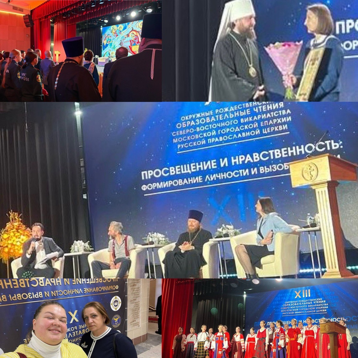 РОЖДЕСТВЕНСКИЕ ЧТЕНИЯ Рассказывает учитель начальной школы корпуса 1236 Наталия Владимировна МЕЛЬНИК: - Я, как преподаватель курса ОРКС по «Православию», ежегодно имею честь быть участником рождественских чтений. Вот и в этом году 5 декабря прошли XIII Окружные Рождественские образовательные чтения Северо-Восточного викарианства. В этом году форум стал площадкой для глубокого диалога о том, как в современном мире можно взращивать целостную личность, гармонично сочетающую знания и внутреннюю нравственную крепость. Тема встречи: «Просвещение и нравственность: формирование личности и вызовы времени». Исторически Русская Православная Церковь стояла у истоков создания русской государственности и культуры, сыграла огромную роль в образовании и просвещении. Её подход всегда был направлен на преображение души и поиск смысла, который является «достоянием веры» и не может быть полностью заменён наукой и философией. Современная Церковь видит свою миссию в служении благу личности и общества