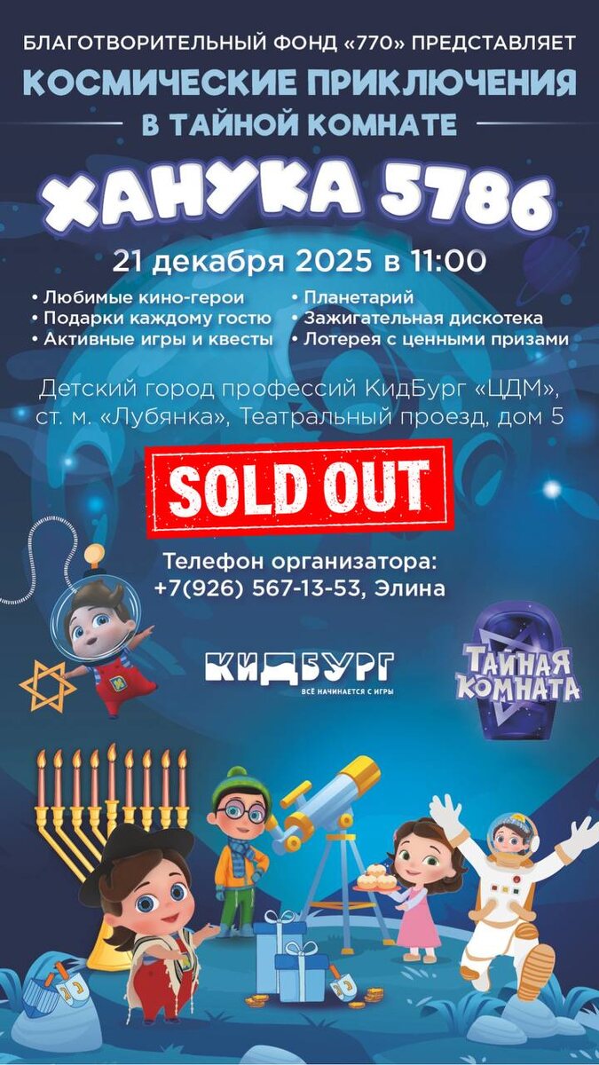 Билеты на Хануку в Кидбурге проданы! А у вас еще есть возможность попасть на наш праздник! Успейте принять участие в розыгрыше комплекта билетов: https://dzen.ru/media/rabbiman_kidstvshow/razygryvaem-bilety-na-hanuku-v-kidburge-6930589eb6dc024aa7fa77a1 Результаты объявим уже 10 декабря. С нетерпением ждем встречи с вами на самом добром и светлом празднике!