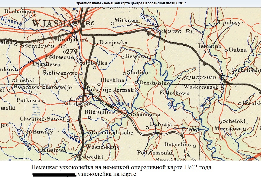 Самые крупные железнодорожные мосты через реки Угра-144 метра и Сигоса- 146 метров. Были построены станции: Ермаки, Вешки, Коньшино, Марфино, Маньшино, Заречье, Знаменка, Замошье, Богатырь, Остров, Чернь, Якимцево, Митьково и Лужки. На линии работало 9 паровозов и 4 дизельных локомотива, использовалось 320 вагонов. Узкоколейка проработала недолго, 27 февраля 1943 года поступил приказ об отступлении немецкой армии с Ржевско-Вяземского плацдарма.