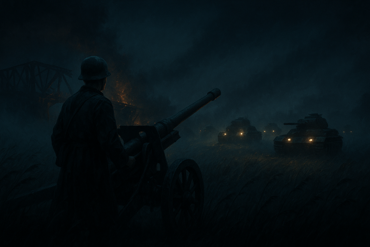 И вот на горизонте дрогнула линия воздуха. Сначала — шёпот моторов, затем — рёв. Немецкая армада. Танки, бронемашины, грузовики, почти шесть десятков единиц. Для одного бойца — число непостижимое.