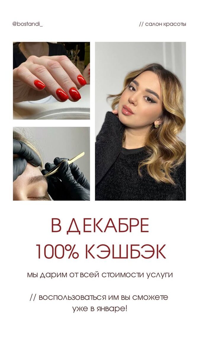 Декабрь — месяц подарков 🎁 // В этом месяце всем нашим гостям мы начисляем 100% кэшбэк от всей стоимости услуги! Воспользоваться им можно будет уже в январе! // Также у вас есть возможность поучаствовать в беспроигрышной новогодней лотерее, где каждого ждут гарантированные призы Можно выиграть комплекс маникюра у топ-мастера или даже сложное окрашивание стоимостью 36 000₽🔥 🎀 Записывайтесь на любимые процедуры или сразу комбо, например, на Новогодний образ на корпоратив, и получайте кэшбэк 100% и возможность участвовать в лотерее!