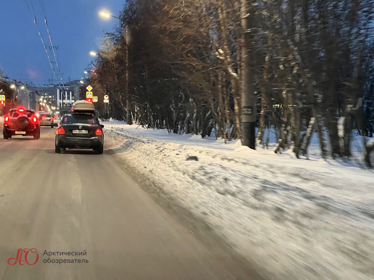 Читая героические эпосы про то, как УДХ героически вывозит тонны снега с улиц Мурманска и засыпает их тоннами соли, невольно задаёшься вопросом – отчего же этот снег лежит на обочине дороги? И ладно бы на периферийных улицах (там можно с натяжкой списать на припаркованный транспорт), но на центральных-то в чём проблема убрать? ❄ «Арктический Обозреватель» // На фото – минус метр дорожного полотна с каждой стороны по улице Шмидта.