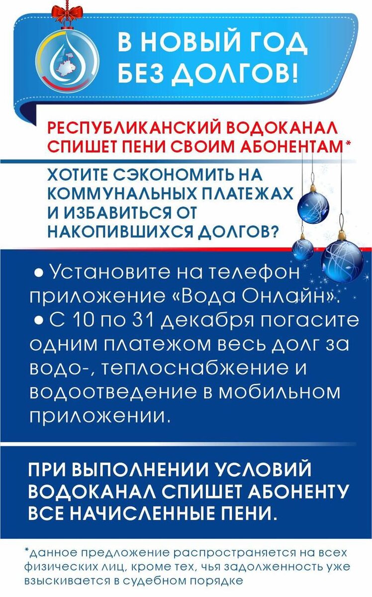 ❄️Оплатите долг — простим пени: такой подарок делает Водоканал к Новому году. 🪩ГУП «РПВВ» запускает акцию «В новый год — без долгов». Это отличная возможность сэкономить на коммунальных платежах и избавиться от накопившихся долгов в преддверии праздников. Условия: ▫️Установите на телефон приложение «Вода Онлайн». ▫️С 10 по 31 декабря погасите одним платежом весь долг за водо-, теплоснабжение и водоотведение, а также текущую квитанцию в мобильном приложении. ✔️При выполнении условий акции Водоканал спишет 100% начисленных пени. Важно: Акция распространяется на всех физических лиц, кроме тех случаев, когда задолженность уже взыскивается в судебном порядке. Оплачивайте услуги ЖКХ с выгодой и не упустите шанс встретить 2026 год без долгов!