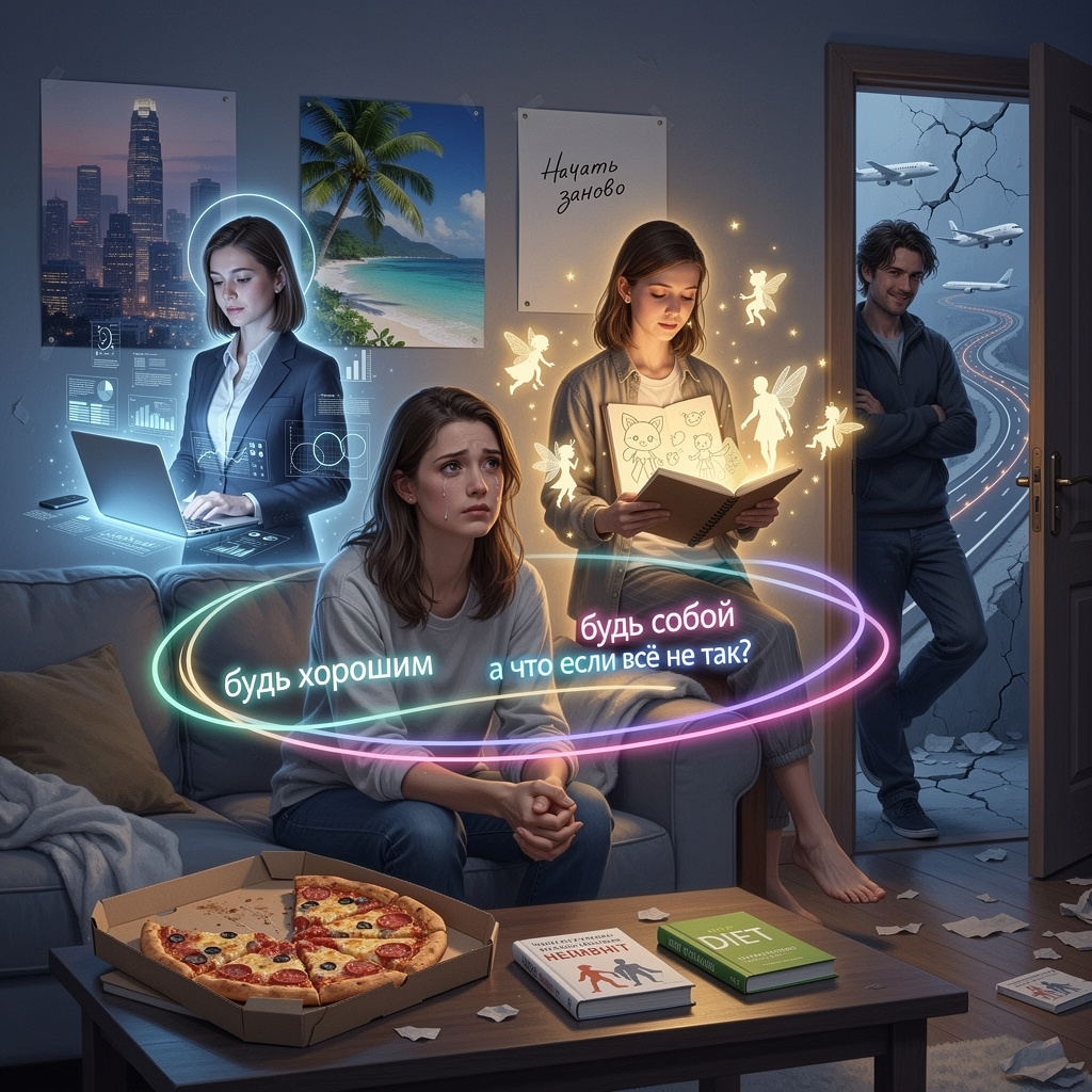 Знаете эту штуку, когда одновременно хочется пиццы и похудеть? Или когда мечтаешь о большой любви, но при первых признаках серьезных отношений сбегаешь? Поздравляю, у вас классический случай того, что я называю "синдром раздвоения личности нормального человека". Вчера ко мне пришла девушка. Рыдает: "Я же умная, почему делаю такую фигню?" Строит карьеру маркетолога, но втихую пишет детские сказки. Родители гордятся офисным успехом, а она чувствует себя предательницей собственной души. Классика. Внутри нас живет как минимум три человека, и они друг друга терпеть не могут. Первый - это тот, кем мы должны быть по мнению окружающих. Успешный, правильный, предсказуемый. Второй - кем мы хотим быть втайне. Свободный, творческий, немного безумный. А третий вообще тихий психопат - он хочет все разрушить и начать заново. И вот они сидят в твоей голове и устраивают междоусобицу. Один кричит "надо работать", второй "хочу на Бали", третий молча планирует, как послать всех к черту. Отсюда все наши с